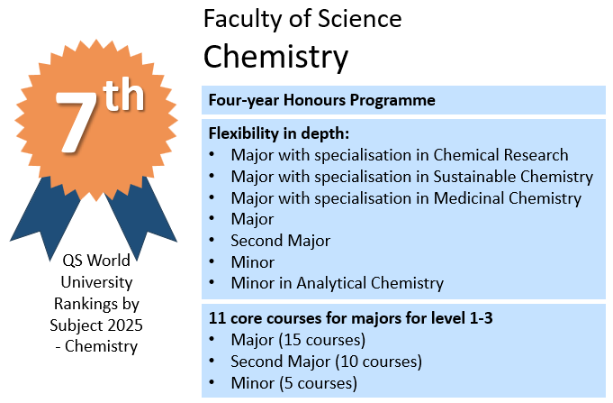 The NUS Chemistry Programme is a four-year programme leading to a BSc (Hons) under the College of Humanities and Sciences (CHS). Under CHS, you will have flexibility in depth in your study of chemistry, the opportunity to combine your chemistry education with other fields of study from both the Faculty of Science (FOS) and Faculty of Arts and Social Sciences (FASS), along with a foundational CHS core curriculum. Find more here. |