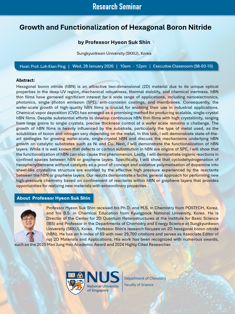 Professor Hyeon Suk Shin from Sungkyunkwan University (SKKU), Korea will give a research seminar on “Growth and Functionalization of Hexagonal Boron Nitride” on 28 January 2026 (Wednesday), 10am at the Executive Classroom S8-03-10. Details of his seminar can be found below and all are welcome.