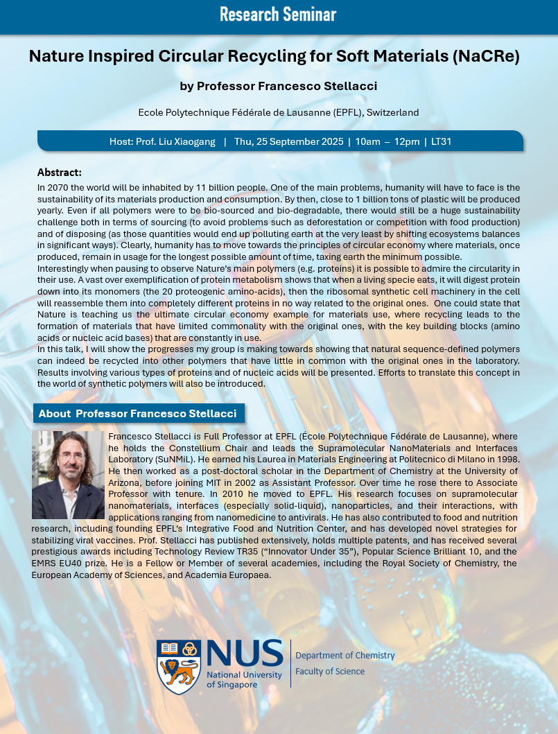 Professor Francesco Stellacci will give a research seminar on “Nature Inspired Circular Recycling for Soft Materials (NaCRe)” on 25 September 2025 (Thu), 10am, at LT31. Details of his seminar can be found below and all are welcome.