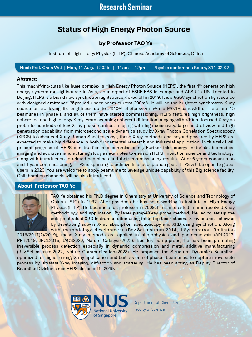 Professor TAO Ye will give a research seminar on “Status of High Energy Photon Source” on 11 August 2025 (Mon), 11am, at Physics conference Room, S11-02-07. Details of his seminar can be found below and all are welcome.