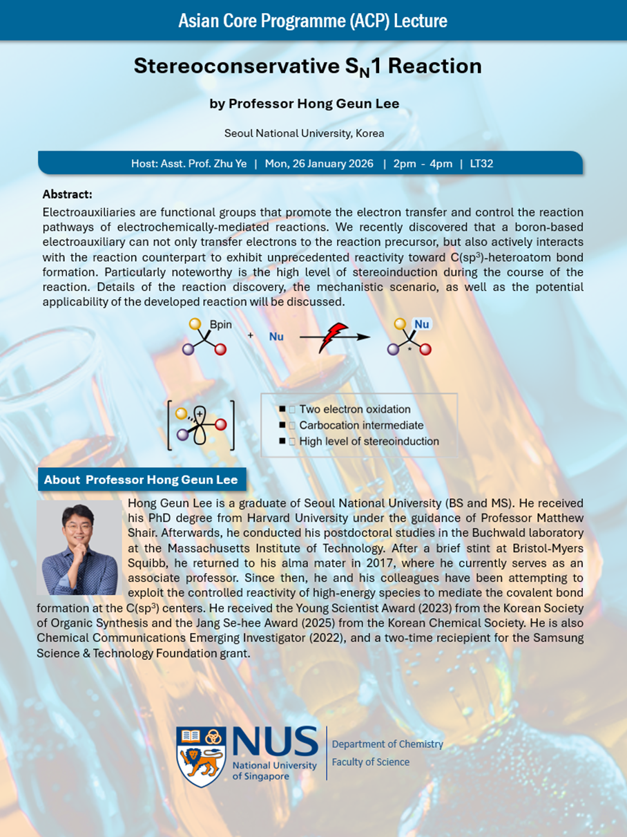 Professor Hong Geun Lee from Seoul National University, Korea will give an Asian Core Programme (ACP) Lecture on “Stereoconservative SN1 Reaction” on 26 January 2026 (Monday), 2pm, at LT32. Details of his seminar can be found below and all are welcome.