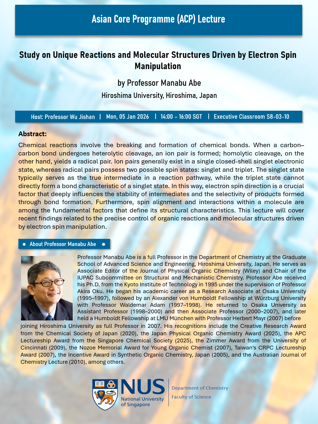 Professor Manabu Abe from Graduate School of Advanced Science and Engineering, Hiroshima University, Japan will give an ACP Lecture on “Study on Unique Reactions and Molecular Structures Driven by Electron Spin Manipulation” on 05 January 2026 (Monday), 2pm, at the Executive Classroom S8-03-10. Details of his seminar can be found below and all are welcome.