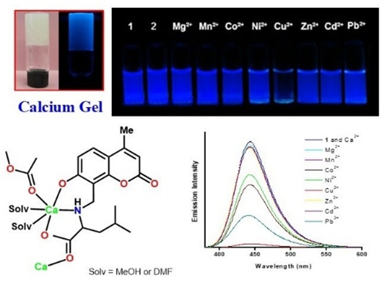 Metal–organic gels are promising chemosensors for metal ions of biological and environmental relevance, particularly toxic Cu²⁺ ions. Coumarin-based sensors are attractive due to their low toxicity and ease of functionalization. Here the luminescent N-(7-hydroxy-4-methyl-8-coumarinyl)-leucine (H₂muleu) ligand forms a coordination polymeric gel with Ca2+ ion. This organogel shows intense blue fluorescence at 455 nm, markedly enhanced compared to the free ligand. Both H₂muleu and its Ca²⁺ gel exhibit high selectivity and sensitivity toward Cu²⁺ ions in aqueous media, especially as nitrates, with low detection limits. Complete fluorescence quenching enables naked-eye Cu²⁺ detection under UV light, demonstrating a rare water-soluble chemosensor system suitable for environmental and biological monitoring. Chemistry – An Asian J., 2025, 20(24), e70467.